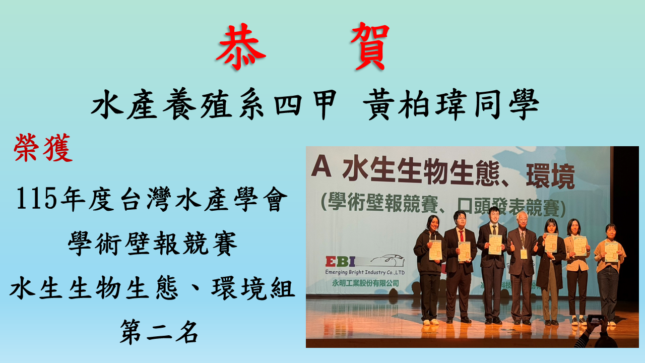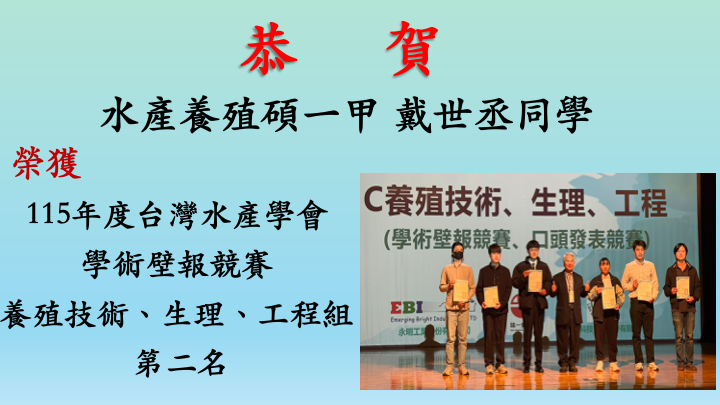 🏆水產養殖碩一甲 戴世丞同學 榮獲養殖技術、生理、工程組 第二名🎉