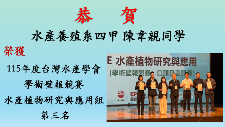 🏆水產養殖系四甲 陳韋親同學 榮獲水產植物研究與應用組 第三名🎉